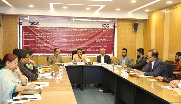 বেসরকারি গবেষণা সংস্থা রিসার্চ অ্যান্ড পলিসি ইন্টিগ্রেশন ফর ডেভেলপমেন্টের (র্যাপিড) সাম্প্রতিক এক গবেষণায় এমন তথ্য উঠে এসেছে। শনিবার ঢাকা বিশ্ববিদ্যালয়ের (ঢাবি) সামাজিক বিজ্ঞান অনুষদের উন্নয়ন অধ্যয়ন বিভাগে আয়োজিত এক পরামর্শ সভায় গবেষণাটির তথ্য উপস্থাপন করা হয়। গবেষণায় বলা হয়েছে, এলডিসি থেকে উত্তরণের পর বাংলাদেশের রপ্তানি প্রতিযোগিতা ধরে রাখতে কয়েকটি গুরুত্বপূর্ণ পদক্ষেপ নেওয়া জরুরি। এর মধ্যে ইইউর সঙ্গে সুবিধাজনক বাণিজ্য চুক্তি নিশ্চিত করা এবং নতুন সম্ভাবনাময় বাজারে অনুকূল বাণিজ্য সুবিধা অর্জনের জন্য আলোচনা এগিয়ে নেওয়া। পাশাপাশি প্রযুক্তির ব্যবহার, শ্রমিকদের দক্ষতা বৃদ্ধি ও পণ্যের বৈচিত্র্য বাড়িয়ে উচ্চমূল্যের পণ্য তৈরিতে মনোযোগী হতে হবে।